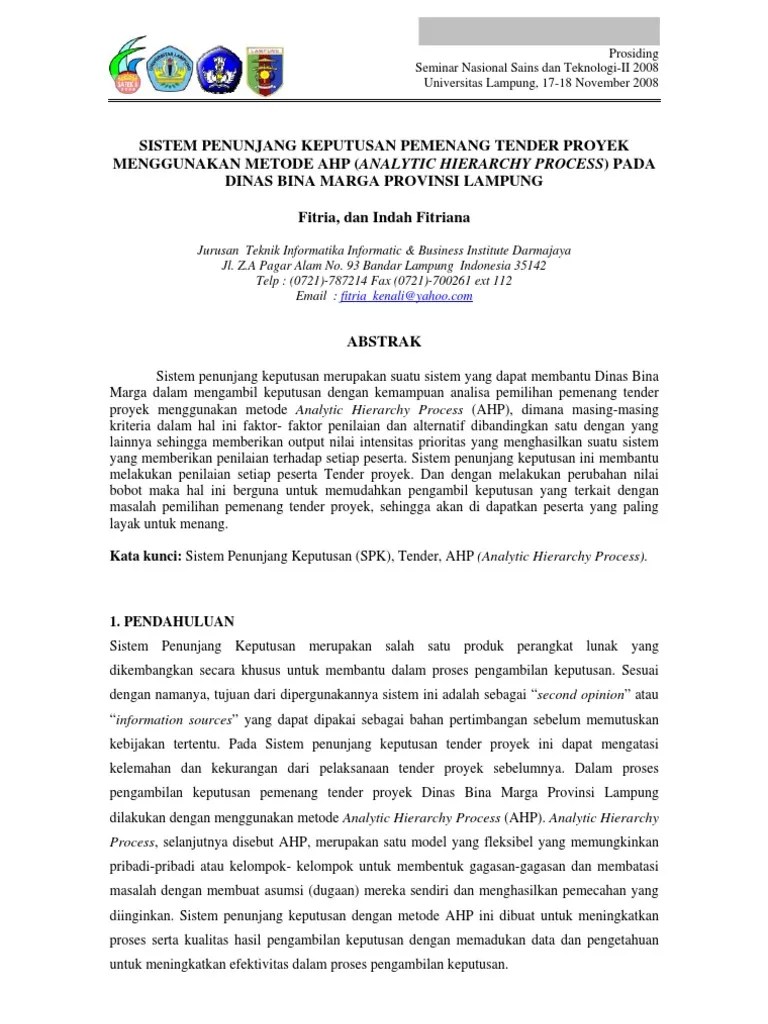 Metode tender, pascakualifikasi, satu file, sistem harga terendah,kontrak. Analisis dan perancangan sistem pendukung keputusan pemilihan supplier terbaik dari. Dengan demikian, metode benefit cost ratio (bcr) dapat digunakan sebagai sistem pendukung keputusan untuk menentukan pemenang tender proyek. Sistem yang sedang berjalan saat penentuan pemenang tender proyek pada . Pengambilan keputusan dalam penentuan pemenang tender pekerjaan konstruksi (tidak kompleks) pada pembangunan gedung kuliah fakultas ekonomi univesitas udayana ( .